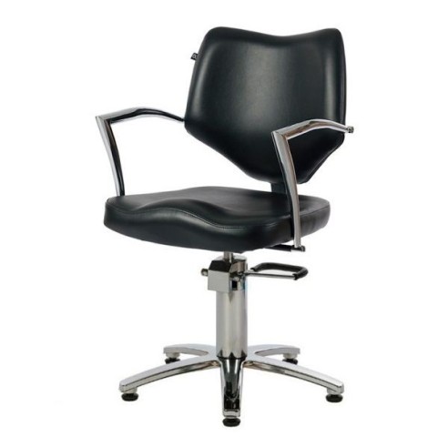 Sillón de peluquería con brazos cromados y base en forma de estrella. Medidas: 55x57x57/71 cm Peso: 23 kg Tapicería: PVC
